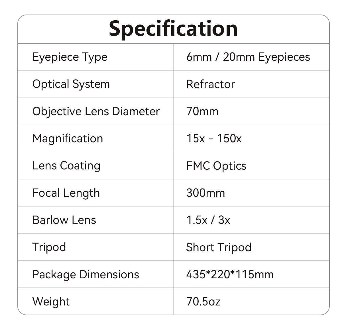 - Refractor Optical System - Provides clear, true-to-life images with accurate color reproduction, ideal for stargazing and sightseeing.