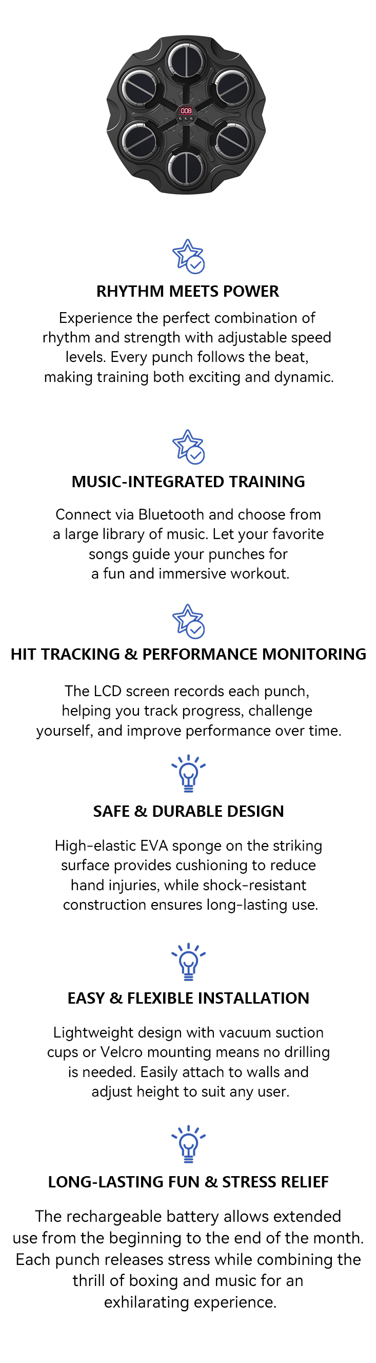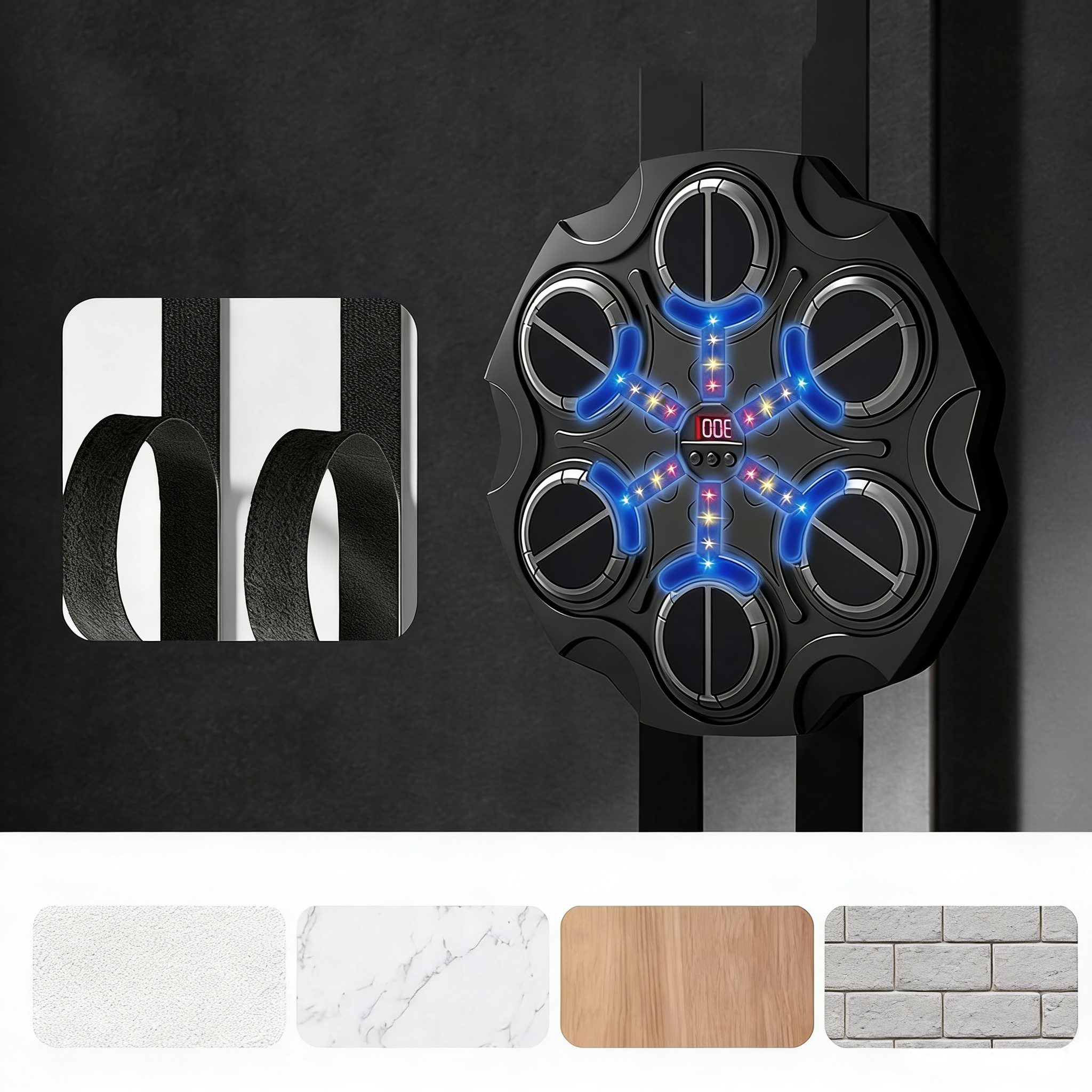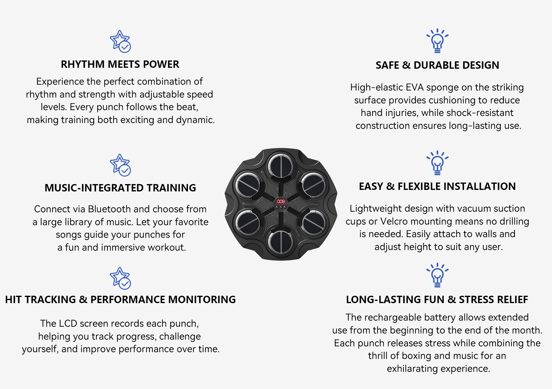 The Clairus Musical Boxing Machine features multiple adjustable speed levels and an LCD smart counter that records every hit for measurable, motivating workouts. Advanced LED guidance syncs with the music rhythm to help maintain proper punching form and precise timing, supporting continuous skill improvement while making training more engaging and effective.