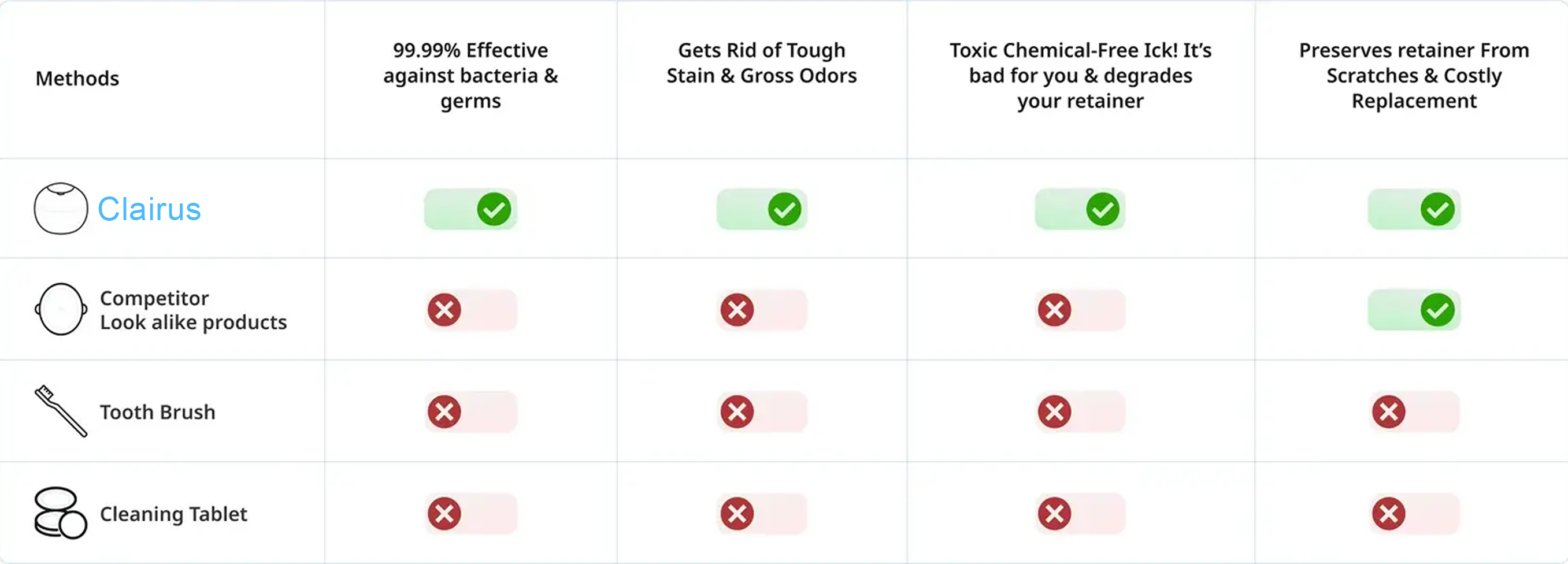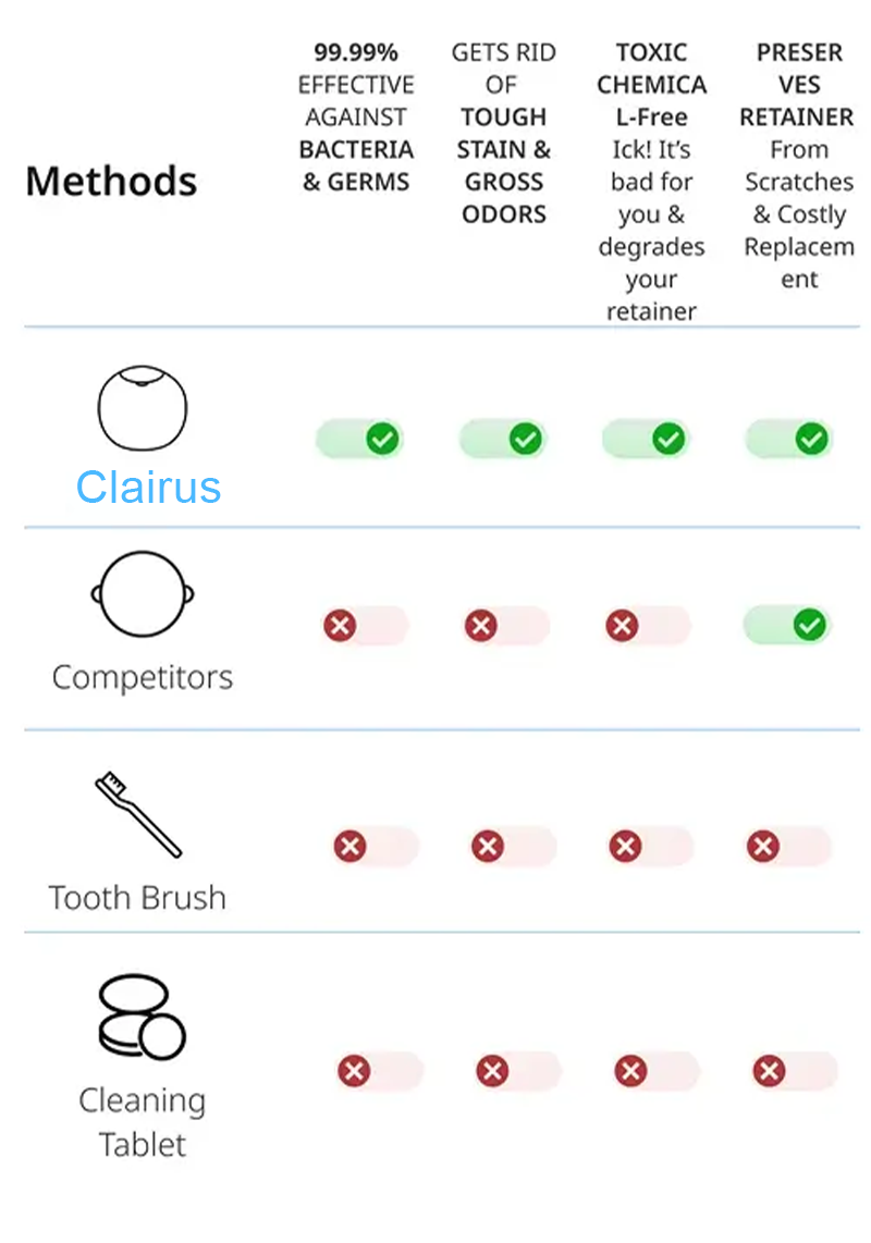 Clairus Naturally kills 99.99% of bacteria, bad-breath germs, & nasty plaque from your retainer in just 5 minutes.