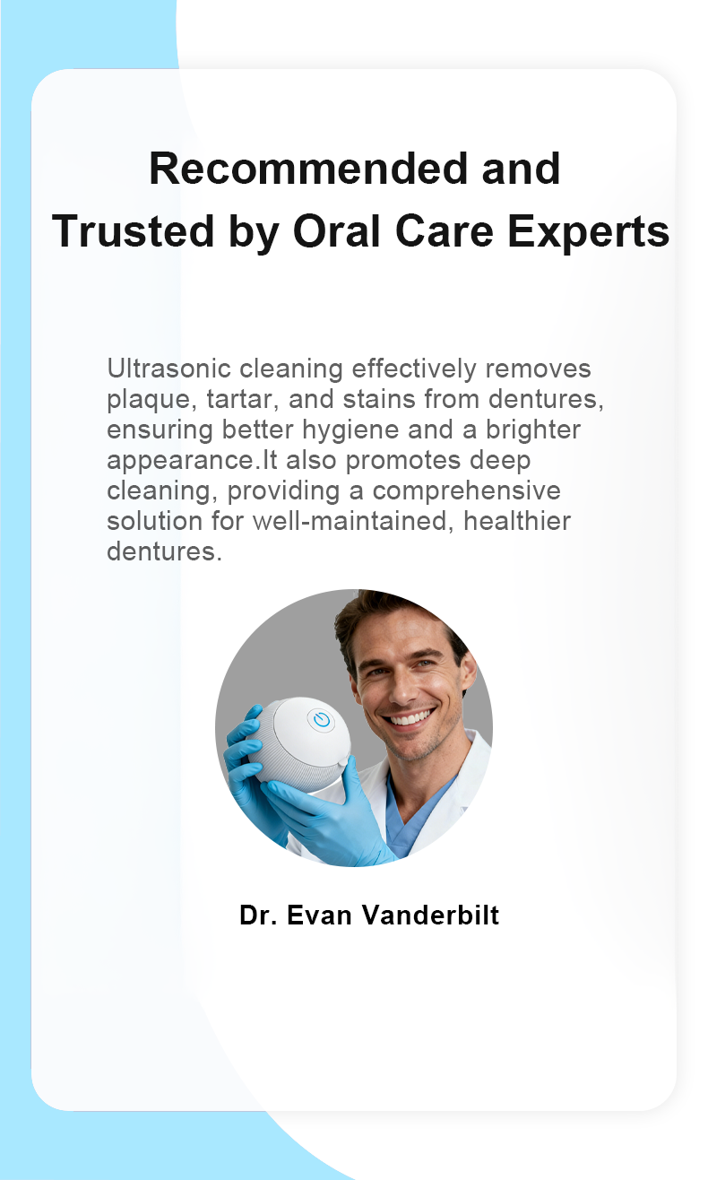 In just 5 minutes, ultrasonic cleaning technology with over 42,000 Hz frequency deeply cleans the surface and gaps of dentures, removing stubborn plaque, tartar, and stains. Gentle yet effective, it preserves the surface of your dentures without damage, leaving them looking brand new. Enjoy thorough cleaning and a bright smile in just 5 minutes, maintaining both hygiene and aesthetics.